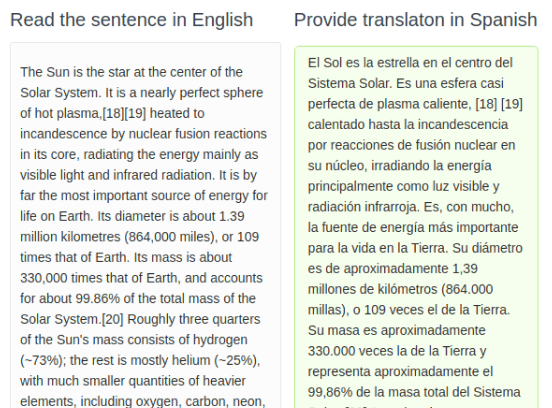 <Text name="english" value="$english" />Use the TextArea control tag to provide an editable, required text box to provide a translation of the text, and include a Submit button for annotators: